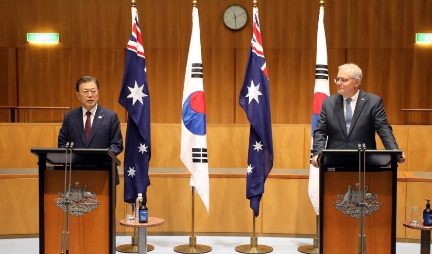 호주측 기자는 '한국과 호주 모두 중국의 경제보복 경험이 있는데 이를 어떻게 대처할 것인가'라는 취지의 질문을 하자 문 대통령은 "한국은 분명 중국과 관계에 있어 갈등하는 문제와 경쟁하는 문제도 있다. 그러나 기후변화나 공급망 문제, 감염병 등 협력해야 할 글로벌 과제도 있다"고 답했다.
