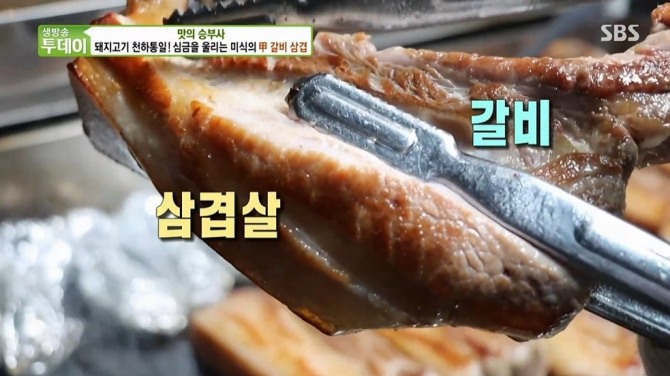 두툼한 삼겹살에 갈비가 붙어 있는 부위를 구운 것으로 고객들은 "삼겹살인데 갈비 향이 난다"고 평했다.