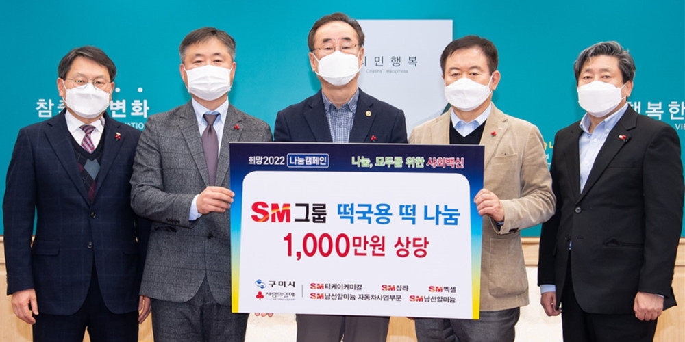 이미지 확대보기지난 10일 구미시청 국제통상협력실에서 열린 나눔캠페인 행사에는 SM그룹 계열사인 티케이케미칼·삼라·남선알미늄·남선알미늄자동차사업부문·벡셀 등이 동참해 구미시에서 추천하는 대상자들에게 떡국용 떡 5,000인분(1,000만원 상당)을 지원했다.