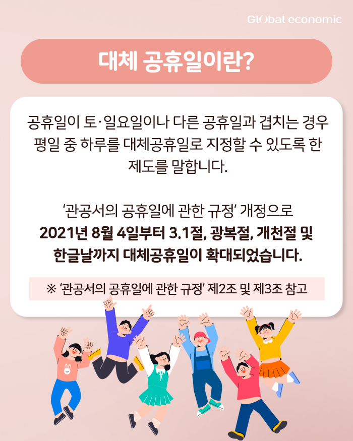 ‘관공서의 공휴일에 관한 규정’ 개정으로 2021년 8월 4일부터 3.1절, 광복절, 개천절 및 한글날까지 대체공휴일이 확대되었습니다.