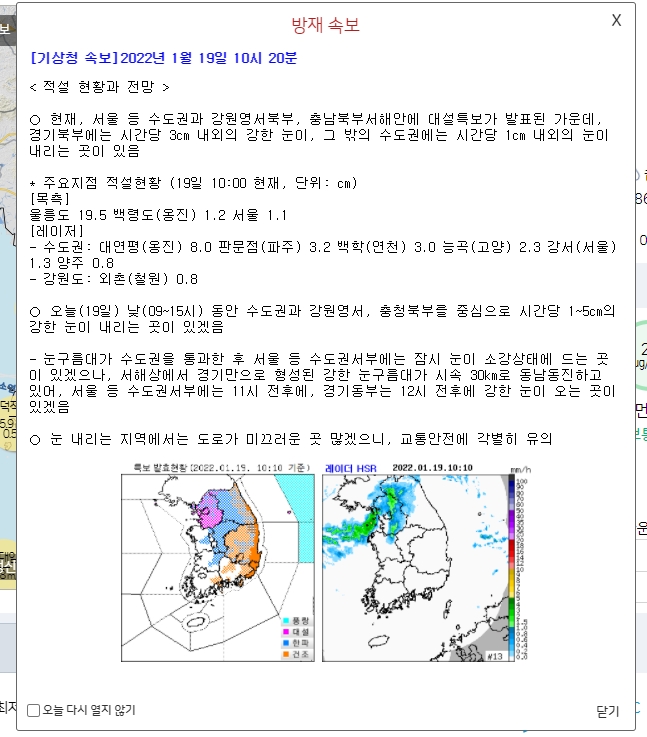 이미지 확대보기기상청은 19일 대설 긴급특보에서 수도권과 강원영서북부, 충남북부서해안에 대설주의보가 발표된 가운데, 경기북부에는 시간당 3cm 내외의 강한 눈이 내리는 곳이 있고, 그 밖의 수도권과 강원영서북부에는 시간당 1cm 내외의 눈이 내리는 곳이 있다고 밝혔다. 주요지점별 적설 현황(19일 10시 현재, 단위:cm)은 수도권: 대연평 8.0 판문점 3.2 백학(연천) 3.0 파주 2.8 능곡(고양) 2.3 강서(서울) 1.3 기상청(서울) 0.8 외촌(철원) 0.8 과천 0.4등 이다
