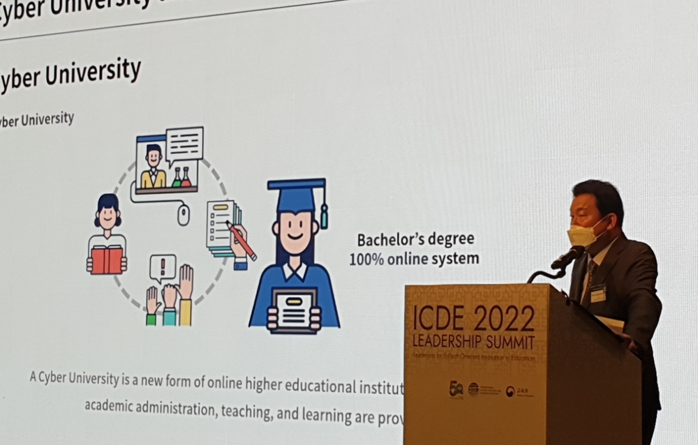 이미지 확대보기한국원격대학협의회 김중렬 회장(사이버한국외국어대학교 총장 직무대행)이 20일 ‘2022 국제원격교육협의회 총장단 회의(ICDE LEADERSHIP SUMMIT)’에 참석해 기조연설을 했다.