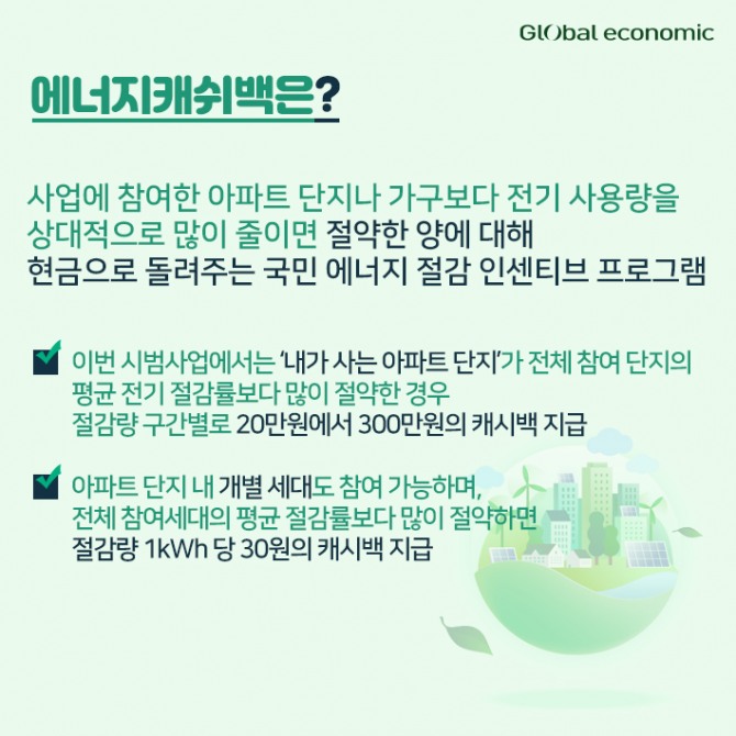 - 아파트 단지 내 개별 세대도 참여 가능하며, 전체 참여세대의 평균 절감률보다 많이 절약하면 절감량 1kWh 당 30원의 캐시백 지급