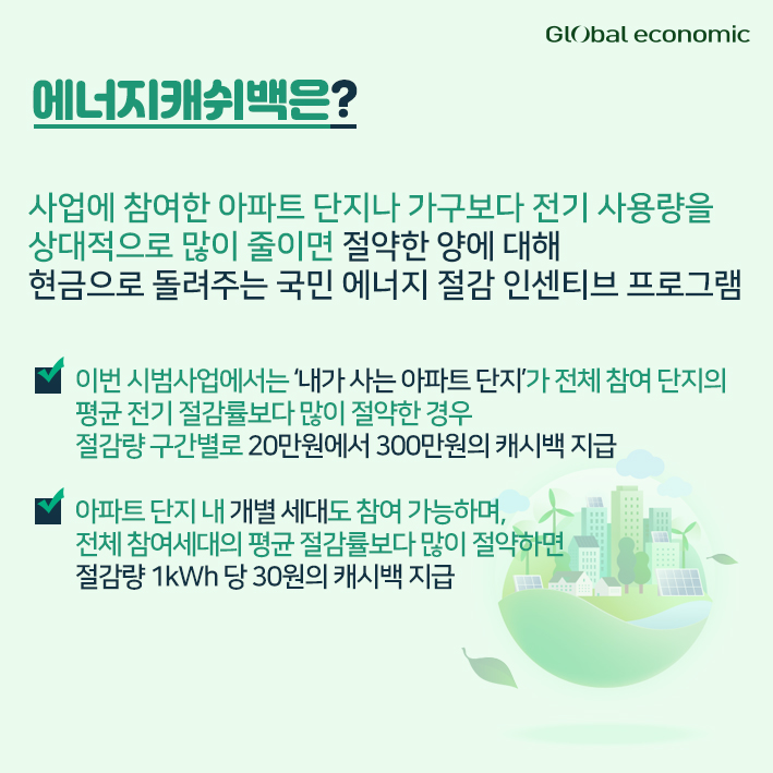 - 이번 시범사업에서는 ‘내가 사는 아파트 단지’가 전체 참여 단지의 평균 전기 절감률보다 많이 절약한 경우 절감량 구간별로 20만원에서 300만원의 캐시백 지급