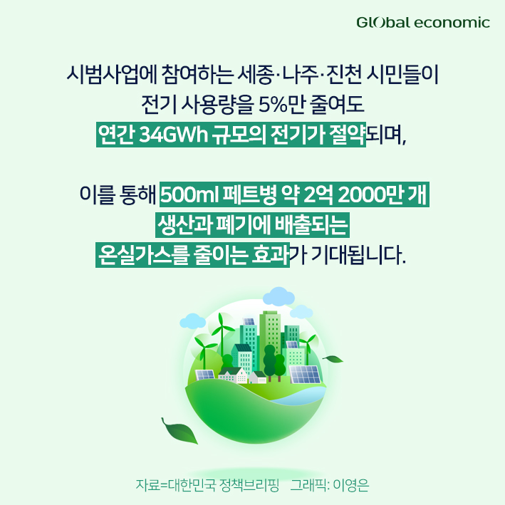 시범사업에 참여하는 세종·나주·진천 시민들이 전기 사용량을 5%만 줄여도 연간 34GWh 규모의 전기가 절약되며, 이를 통해 500ml 페트병 약 2억 2000만 개 생산과 폐기에 배출되는 온실가스를 줄이는 효과가 기대됩니다.