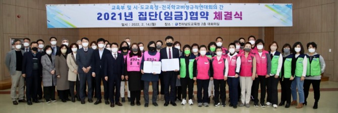 이미지 확대보기교육부 및 17개 시도교육청이 14일 전라남도교육청에서 전국학교비정규직연대회의(참여노조: 전국학교비정규직노동조합, 공공운수노동조합 전국교육공무직본부, 전국여성노동조합)와 2021년 집단(임금)협약을 체결했다.