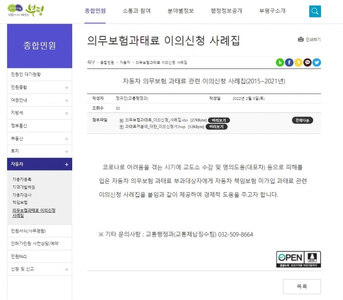 부평구 자동차 의무보험과태료 이의신청 사례집은 구 홈페이지 ‘종합민원-자동차’ 항목에서 확인할 수 있다.