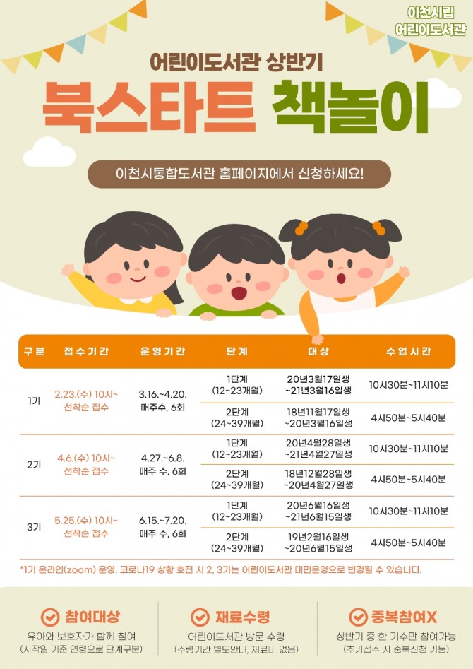 북스타트 책놀이에 참여를 원하는 가정은 이천시통합도서관 홈페이지에서 사전신청 후 참여할 수 있으며, 매 기수 책놀이 시작 3주전부터 선착순으로 참여자 접수를 받기 때문에 미리 도서관 홈페이지에 가입해 놓으면 도움이 된다.
