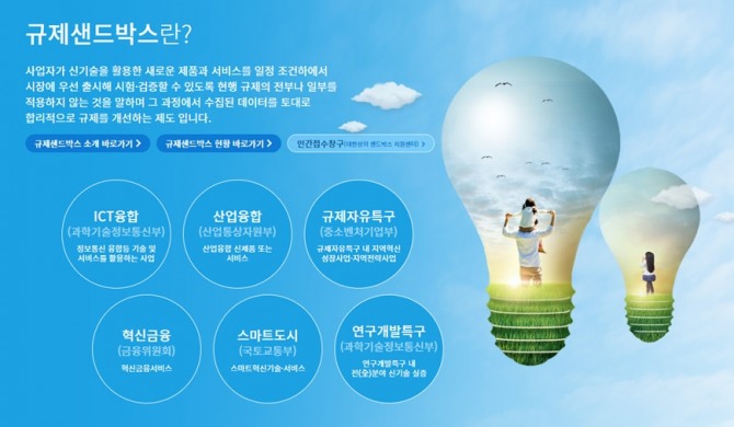 규제샌드박스는 국무조정실 및 과학기술정보통신부·산업통상자원부·금융위원회·중소벤처기업부·국토교통부 등 5개 부ㅏ처가 주관하고 있다.