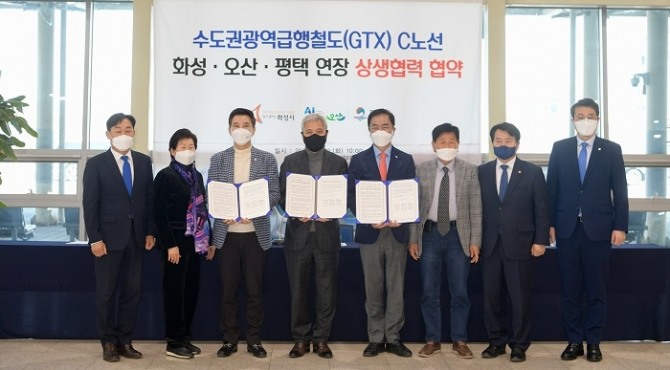 이미지 확대보기경기도 화성시·오산시·평택시는 22일 오산역환승센터에서 곽상욱 오산시장과 서철모 화성시장, 정장선 평택시장 등이 참석한 가운데 수도권광역급행철도(GTX) C노선 연장을 위한 상생협력 업무협약을 체결했다.