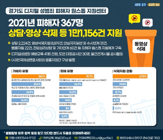 경기도가 디지털 성범죄 피해자 지원 전담 기관인 ‘경기도 디지털 성범죄 피해자 원스톱 지원센터’를 지난해 1년간 운영한 결과 피해자 367명을 대상으로 전문심리상담 지원, 영상 삭제, 법률지원 등 1만1156건을 지원했다고 23일 밝혔다.