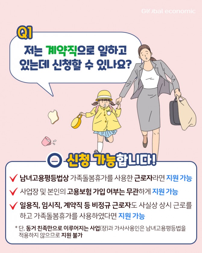 - 일용직, 임시직, 계약직 등 비정규 근로자도 사실상 상시 근로를 하고 가족돌봄휴가를 사용하였다면 지원 가능