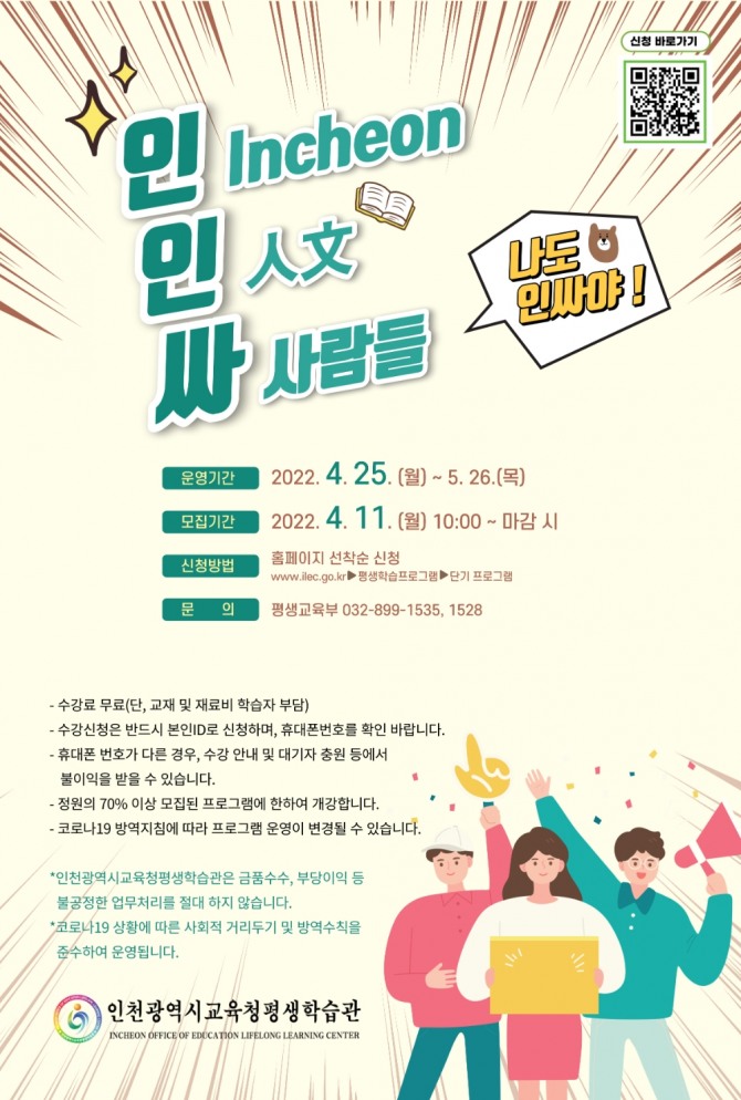 이미지 확대보기인천광역시교육청평생학습관은 봄 햇살처럼 시민들의 마음을 채워줄 인문학 여행 '인(Incheon)인(人文)싸(사람들)' 프로그램 학습자를 11일부터 모집한다고 밝혔다.