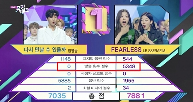 이에 뮤직뱅크 측은 "라디오 방송 점수는 KBS Cool FM의 7개 프로그램을 대상으로 집계하고 있다"면서 "순위 집계 기간인 2∼8일에 KBS TV, 라디오, 디지털 콘텐츠에서 임영웅의 노래가 방송되지 않았다"고 밝혔다. 뮤직뱅크는 순위 산정에서 방송 횟수를 20% 포함한다. 임영웅이 압도적으로 높았던 디지털 음원과 음반 점수는 각각 60%, 5%를 차지한다.