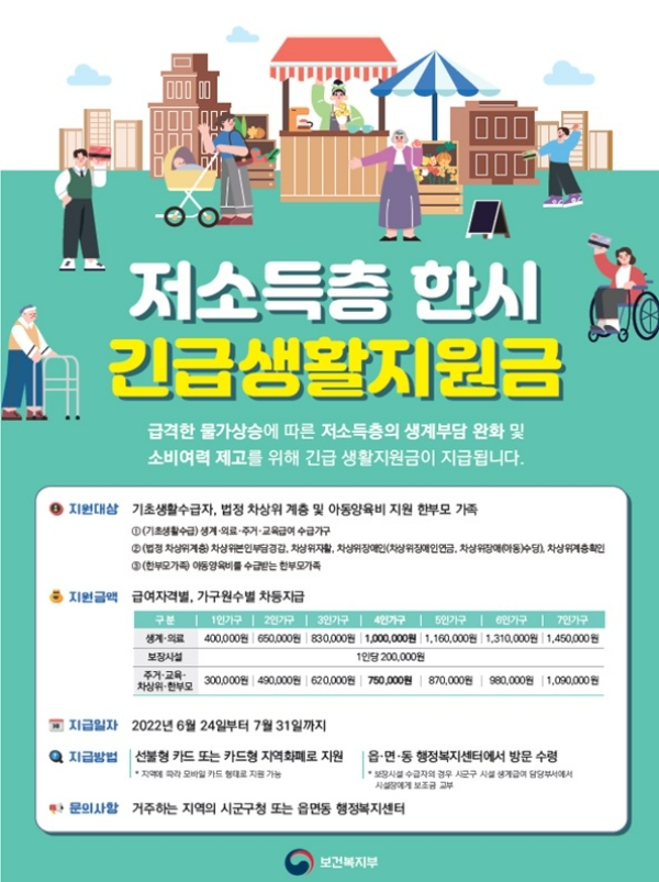 이미지 확대보기19일 보건복지부는 최근 급격한 물가 상승에 따른 저소득층의 생계부담을 완화하고 소비 여력을 제고하기 위한 한시 긴급생활지원금을 오는 24일부터(지자체별 사업 시작 날짜 상이) 지급한다고 밝혔다.