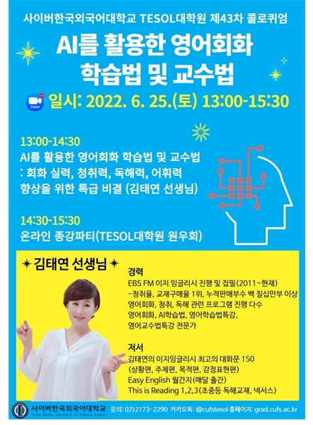 이번 온라인 콜로퀴엄 특강은 EBS 라디오 ‘이지 잉글리시’ 진행자인 김태연 강사가 진행한다. 김태연 강사는 인공지능(AI)을 활용한 영어회화 학습 및 교육 방법을 소개하고, 영어회화 능력 및 청취력, 독해력, 어휘력 향상을 위한 특급 비결을 공유할 예정이다.
