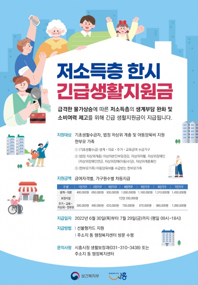 이미지 확대보기경기도 시흥시가 오는 30일부터 코로나19 기간 중 급격한 물가 상승으로 어려움을 겪고 있는 저소득층의 생계 부담을 덜어주고자 한시 긴급 생활지원금을 지급한다고 22일 밝혔다.