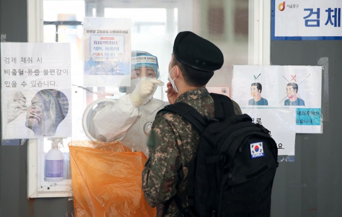 임시선별검사소에서 의료진이 군인의 검체를 채취하고 있다. 사진=뉴시스