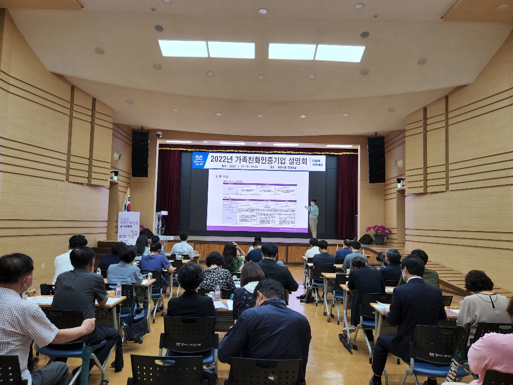 이미지 확대보기이날 설명회에서는 관내 및 인근지역 가족친화인증 희망 중소기업 관계자 50여 명이 참석한 가운데 심사기준, 신청 절차 등 가족친화인증 제도를 안내하고 이어서 희망 기업을 대상으로 컨설팅과 질의응답을 진행했다.