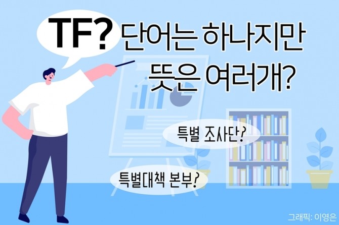 ‘포스코그룹 2030 부산 세계박람회 유치 지원 TF 강화’ ‘아동 학대 처벌 강화를 위한 TF 구성해 양형 기준 검토’에서처럼 TF라는 말이 정부나 기업에서 특별한 일이 있을 경우 자주 등장한다.