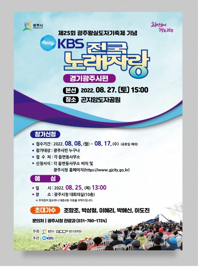 경기도 광주시는 제25회 광주왕실도자기축제를 기념하기 위해 오는 27일 KBS 전국노래자랑을 개최한다고 5일 밝혔다.