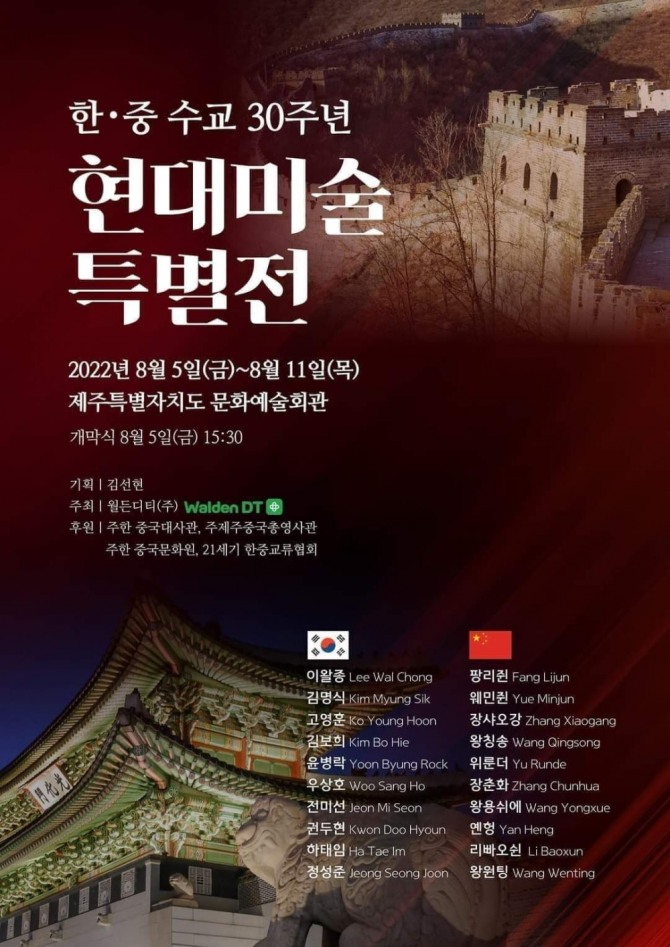 중국작가는 팡리쥔, 웨민쥔, 장샤오강, 왕칭송, 위룬더, 장춘화, 왕용쉬에, 옌형, 리빠오쉰, 왕원팅이 한국은 이왈종, 김명식, 고영훈, 김보희, 윤병락, 우상호, 전미선, 권두현, 하태임, 정성준 작가의 작품이 전시된다.