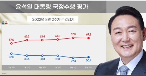 같은 기간 윤 대통령 국정 수행에 대한 부정평가는 67.8%에서 0.6%포인트 줄면서 67.2%를 기록했다.