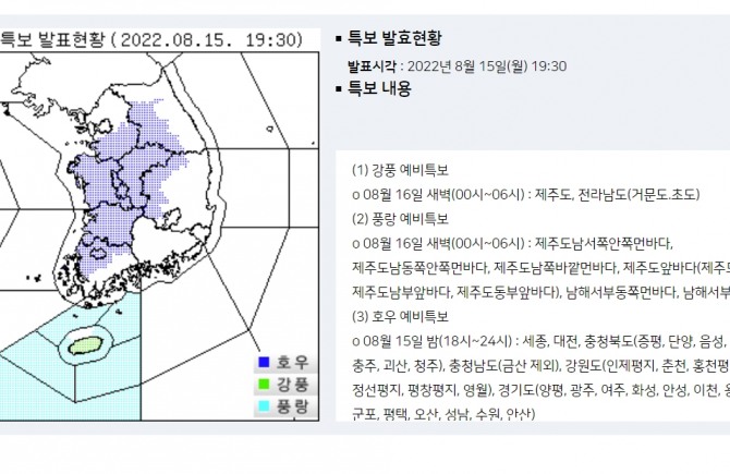 이미지 확대보기기상청은 15일 밤 특보에서 오늘 밤 18시~24시사이 세종, 대전, 충청북도(증평, 단양, 음성, 진천, 제천, 충주, 괴산, 청주), 충청남도(금산 제외), 강원도(인제평지, 춘천, 홍천평지, 원주, 횡성, 정선평지, 평창평지, 영월), 경기도(양평, 광주, 여주, 화성, 안성, 이천, 용인, 의왕, 군포, 평택, 오산, 성남, 수원, 안산) 등에 호우 예비특보를 내렸다. 08월 16일 새벽(00시~06시)에는 경상북도(봉화평지, 영주, 예천, 문경, 상주, 김천, 성주, 구미), 전라북도, 충청북도(영동, 옥천, 보은), 충청남도(금산)에 큰 비가 예상된다. 또 08월 16일 오전(06시~12시)에는 광주, 전라남도(흑산도.홍도, 신안(흑산면제외), 목포, 영광, 함평, 무안, 영암, 화순, 장성, 구례, 곡성, 담양, 나주)등에 호우 특보를 내렸다>