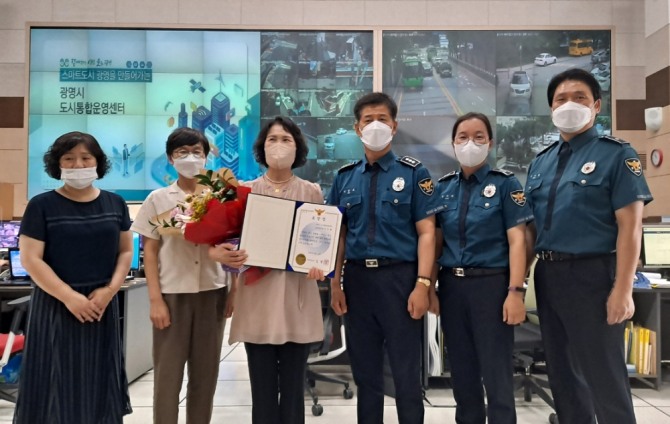 이미지 확대보기실시간 CCTV로 지난 6월 이어 두 번째 결정적 역할로 혐의자 검거에 공을 세운 관제요원이 경찰서로부터 표창장을 받았다. 사진=광명시