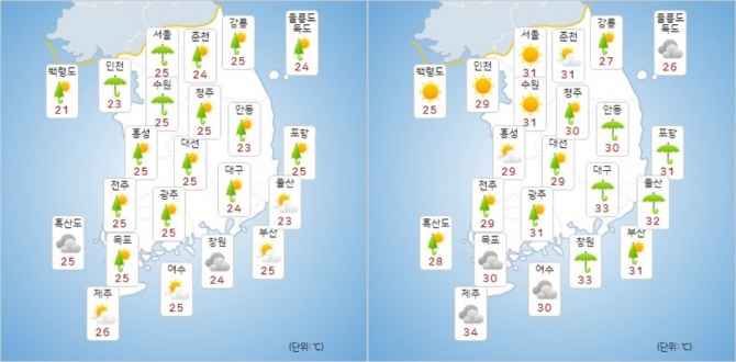 아침 최저기온은 21∼26도, 낮 최고기온은 25∼34도로 예보됐다.