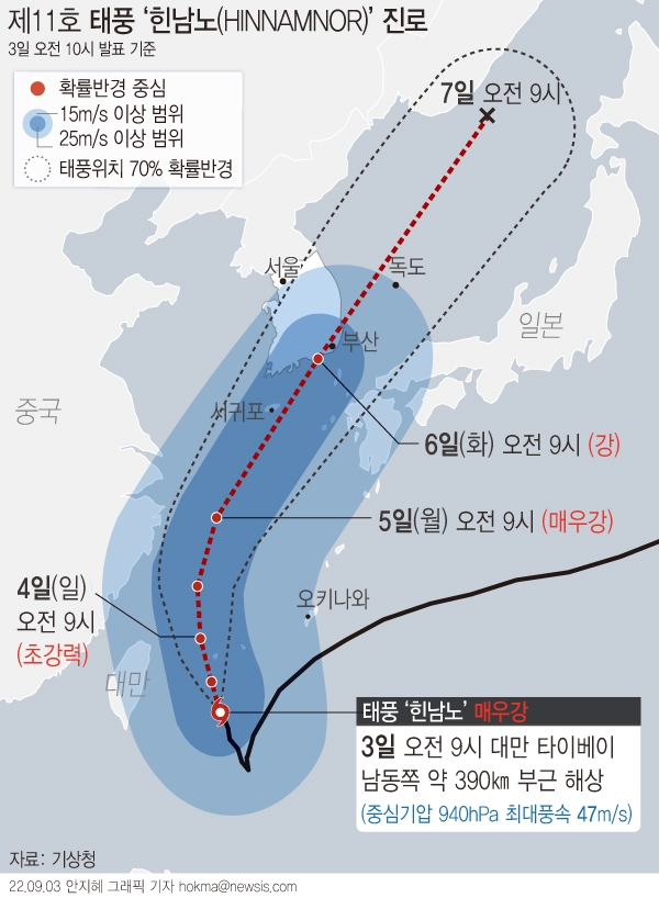 한편 한덕수 국무총리는 3일 제11호 태풍 '힌남노'와 관련 "지자체를 중심으로 경찰, 소방, 민간단체 등이 협조해 사전에 위험 상황이 충분히 안내될 수 있도록 하라"고 당부했다고 연합뉴스가 보도했다.