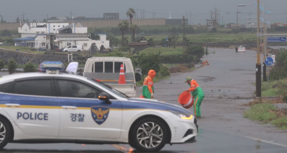 태풍 힌남노가 한반도를 향해 북상 중인 4일 제주도 송악산 해안도로를 경찰이 통제하고 있다.