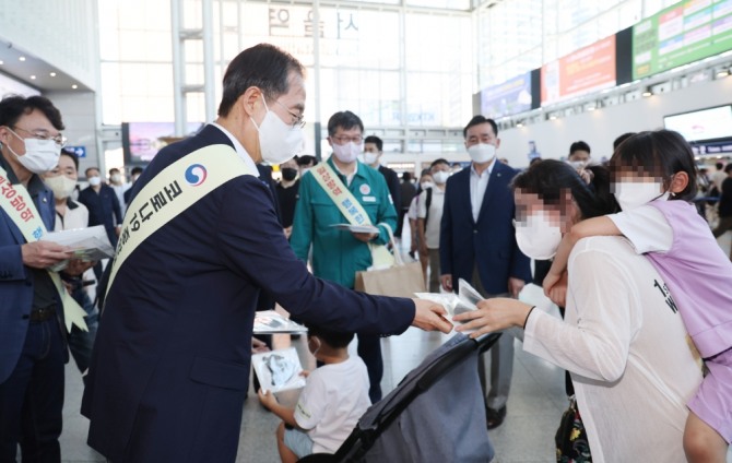한 총리는 이어 서울역 맞이방에서 귀성객에게 일상 방역수칙과 의료이용 방법이 담긴 안내서와 마스크를 직접 나눠줬다.