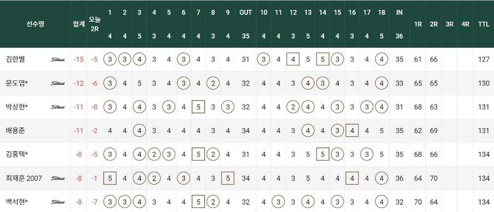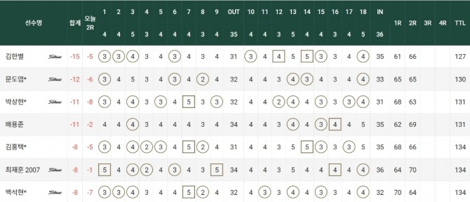 첫날 61타를 쳐 코스레코드와 대회 신기록을 작성한 김한별은 이날 버디 7개, 보기 2개로 5타를 줄여 합계 15언더파 127타를 쳐 문도엽(31·DB손해보험)을 3타차로 제치고 단독선두를 달렸다. 문도엽은 보기 없이 버디만 6개를 골라냈다.