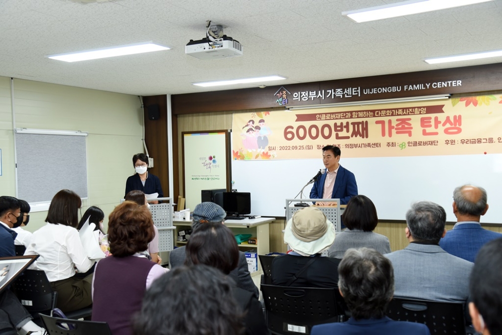 이날 다문화가족사진촬영은 사회복지법인 인클로버재단에서 주최하고 의정부시 가족센터가 참여했으며, 관내 다문화가족 50가구의 사진 촬영 및 6천 번째 가족 탄생 기념식 및 장학금 전달식이 진행됐다.