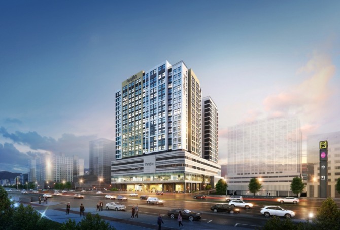 이미지 확대보기이곳은 지하 6층~지상 20층, 2개동에 아파텔 570실과 상업시설 181실이 함께 들어서는 주상복합단지로 아파텔은 전용면적 39~69㎡로 구성되며, 상업시설은 지하 2층~지상 3층 총 5개층 규모다.
