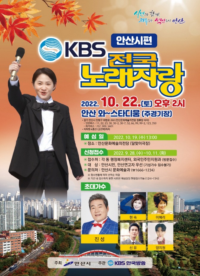 이미지 확대보기경기도 안산시는 전 국민의 사랑을 받는 국내 최장수 프로그램 'KBS 전국노래자랑 안산시편‘이 10월 22일 오후 2시 안산 와~스타디움에서 개최된다고 29일 밝혔다.