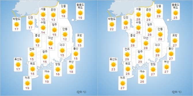 낮 최고 기온은 ▲서울 28도 ▲백령도 22도 ▲인천 25도 ▲춘천 28도 ▲강릉 29도 ▲대전 28도 ▲안동 28도 ▲대구 29도 ▲전주 29도 ▲광주 29도 ▲부산 27도 ▲제주 27도로 예상된다.