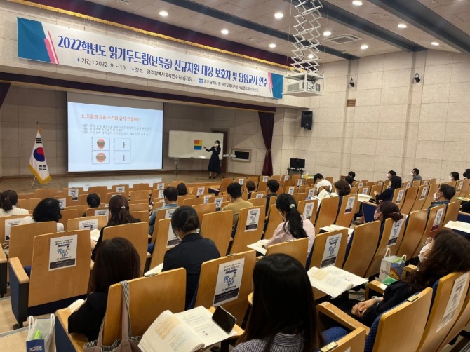 광주동·서부교육지원청이 4일과 6일 이틀에 걸쳐 2022학년도 읽기두드림(난독증) 학생 신규지원 담임교사를 대상으로 연수를 운영했다고 6일 밝혔다.난독증이란 지능과 시력&청력이 모두 정상이고 듣고 말하는 데는 별다른 지장을 못 느낌에도 불구하고 언어와 관계되는 두뇌 신경회로의 문제로 인해 글을 원활하게 읽고 이해하는 데 효율성이 떨어지는 읽기장애 증상을 말한다.