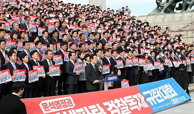 민주당은 이날도 강경 대응을 이어갔다. 국회 본청 앞에서 소속 의원과 원외지역위원장 등 약 1200명(민주당 추산)이 참여한 대규모 시위를 열었다. 이재명 대표는 이 자리에서 "정치권이 서로 협력해도 모자란데 정부여당의 행태는 상대방을 압박하고 무력으로 지배한다"며 "야당 탄압과 전 정권에 대한 공격으로 현 정부가 만들어낸 민생, 국방, 외교, 경제 참사를 가릴 수 없다"고 비판했다. 지지자들을 향해선 "함께 힘을 모아 무도한 정부여당의 폭력을 이겨내자"고 독려했다.
