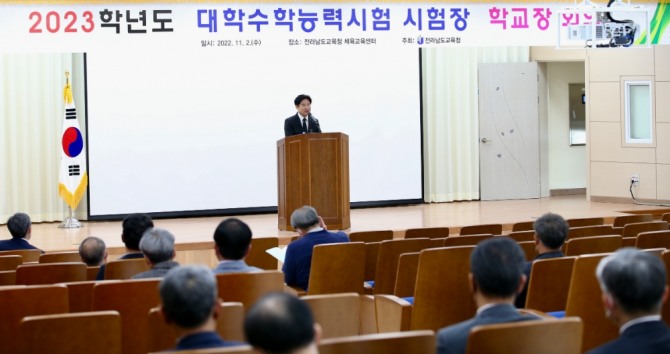 이미지 확대보기전라남도교육청(교육감 김대중)이 2023학년도 대학수학능력시험(11월 17일)의 안전한 시행을 위해 2일 도교육청 체육교육센터에서 53개 시험장학교 교장 회의를 개최했다.