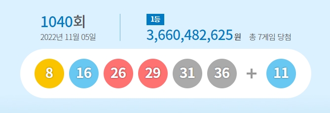 이미지 확대보기로또복권 운영사 ‘동행복권’은 제1040회 로또복권 1등 당첨번호가 '8, 16, 26, 29, 31, 36'라고 5일 밝혔다. 2등 보너스 번호는 '11'이다.