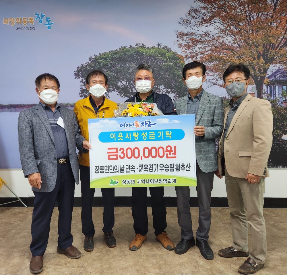 지난 장동면민의 날 민속·체육경기 우승팀 ‘황추산’이 지역 소외계층과 저소득가정을 위해 써달라며 우승상금 30만 원을 기부하였다.