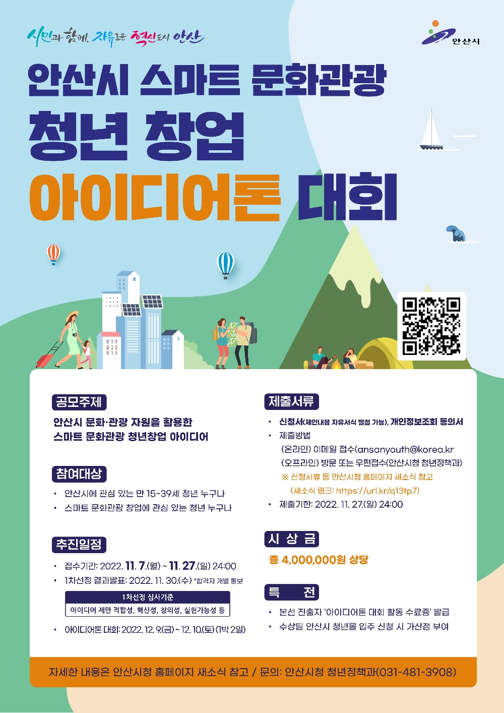 이혜숙 청년정책과장은 “안산의 문화관광 자원을 활용해 혁신적인 창업 아이디어를 갖춘 예비‧초기 창업자를 발굴할 수 있도록 많은 관심과 참여를 부탁한다"고 말했다.