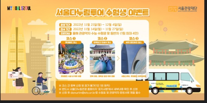 이벤트에 당첨될 경우 모든 코스의 입장권과 체험비는 서울관광재단이 부담하며, 편리한 이동을 위해 휠체어 리프트 차량 ‘다누림 미니밴’을 지원한다.