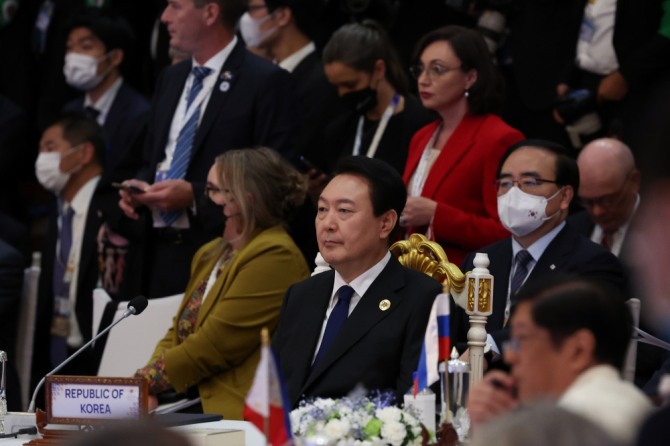 이같이 발언하는 윤 대통령 왼쪽에는 블라디미르 푸틴 러시아 대통령 대신 참석한 세르게이 라브로프 러시아 외무장관이 자리했다. 윤 대통령은 미얀마 쿠데타 유혈사태와 관련, 민주주의 후퇴에 대해 깊은 우려를 표하며 미얀마에서 자유와 민주주의가 다시 꽃필 수 있기를 바란다고도 말했다.