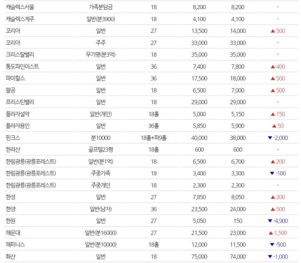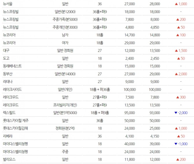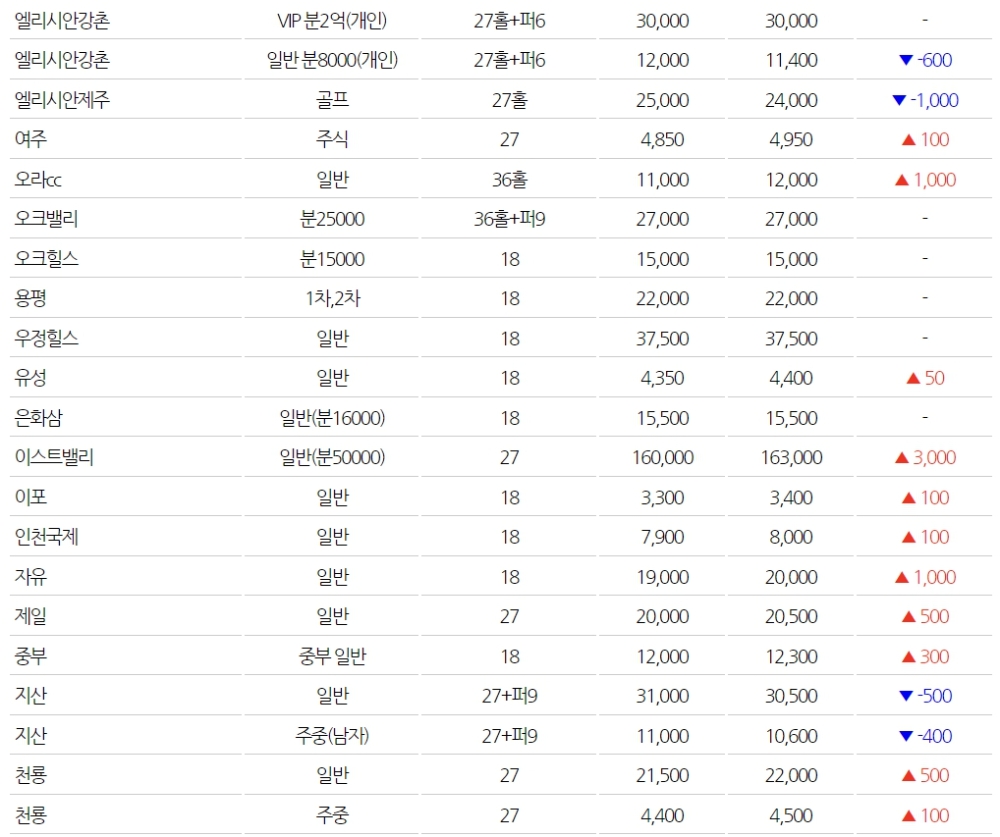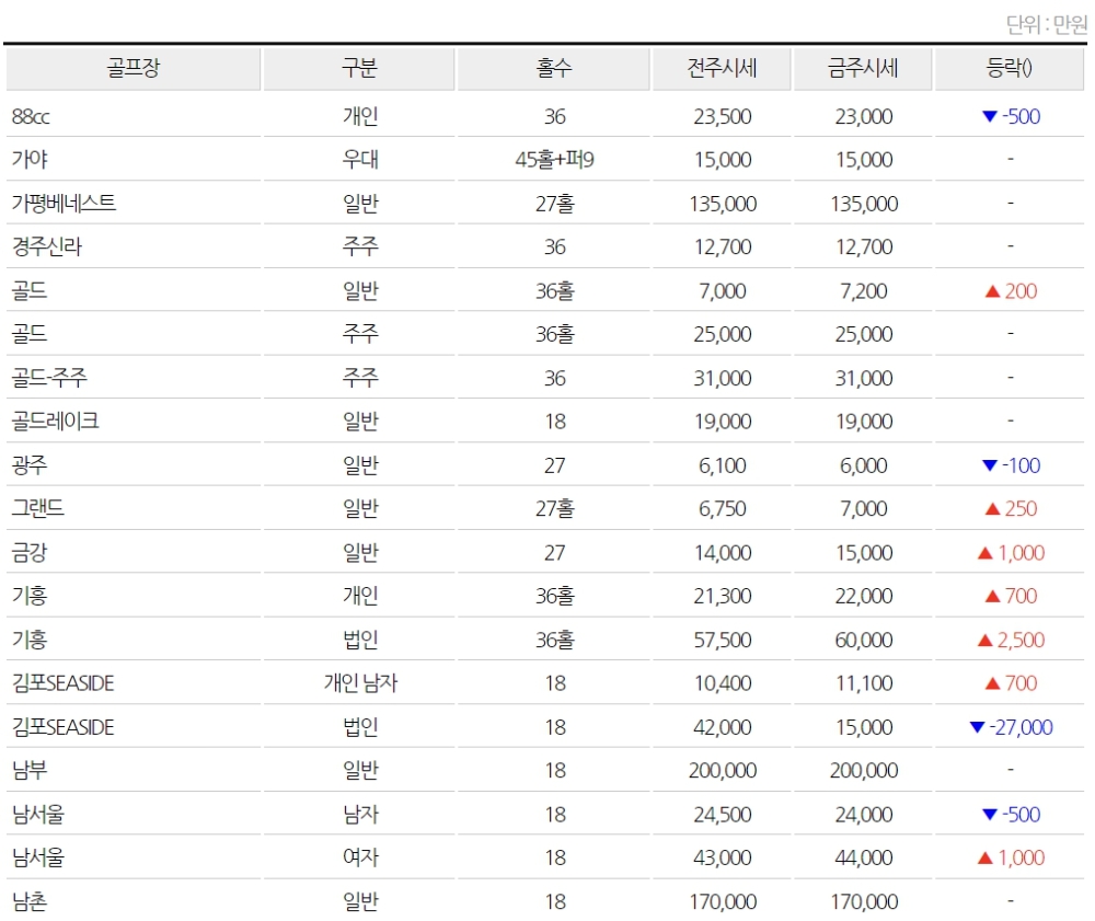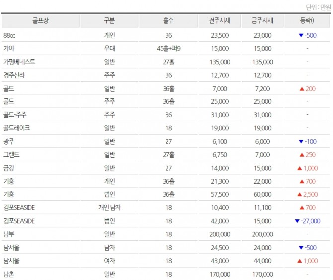 ▲전국 골프회원권 시세(단위: 만원) (※자료=동부회원권거래소)