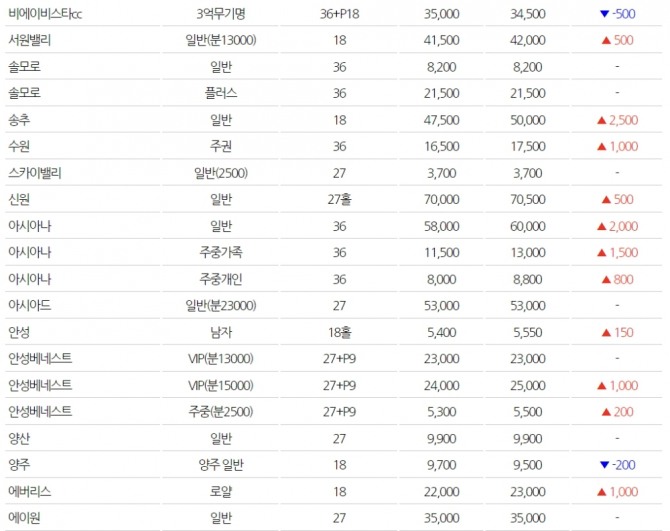 중저가 골프장 중에서 가장 많이 오른 골프장은 동부산으로 2억9000만원에 거래되고 있고, 대구는 1500만원 상승해 1억3500만원, 오라도 1500만원 올라 2억3000만이다.