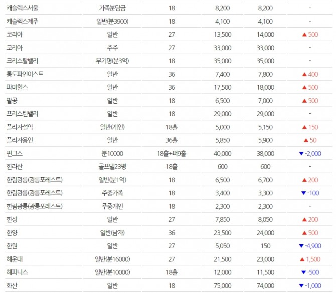 이미지 확대보기국내 회원권의 최고가를 갱신했던 남부가 20억원, 남촌이 17억원으로 제자리 걸음을 하고 있는 가운데 이스트밸리가 3000만원 오른 16억3000만원에 거래되고 있다. 신원, 아시아나, 송추가 소폭 오름세를 보였다.