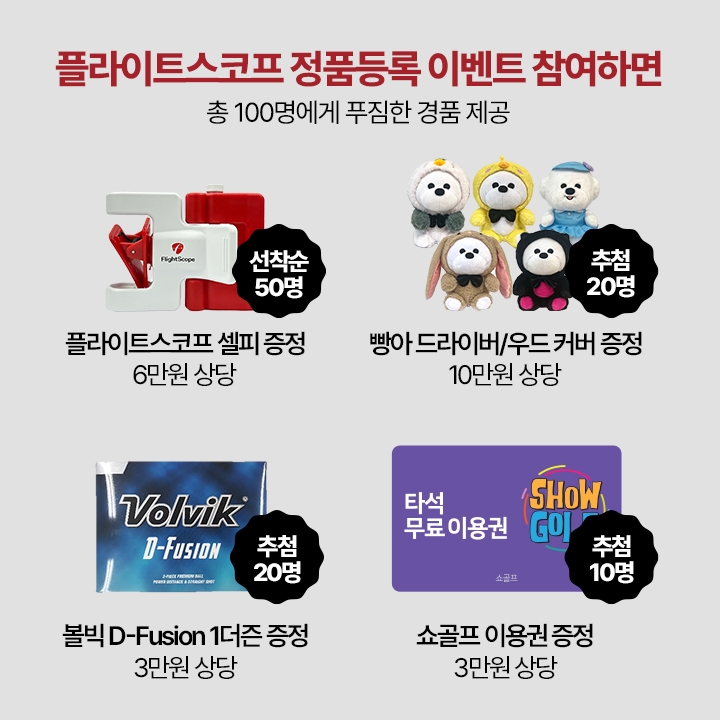이벤트는 고객이 플라이트스코프 제품을 구입한 후 쇼골프 홈페이지에 접속해 제품 하단의 시리얼 넘버를 입력하면 된다. 해외구매 등 공식 판매처 외 제품은 제외된다. 추첨을 통해 총 100명에게 10만원 상당의 클럽 커버, 6만원 상당의 플라이트스코프의 셀피, 골프공 등 경품을 증정한다.